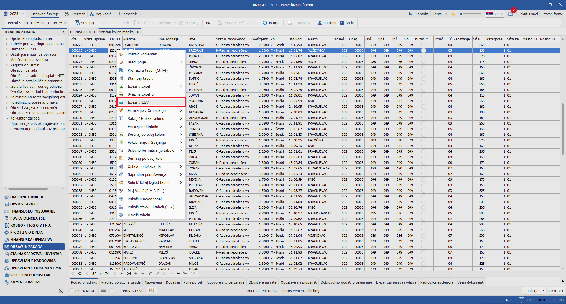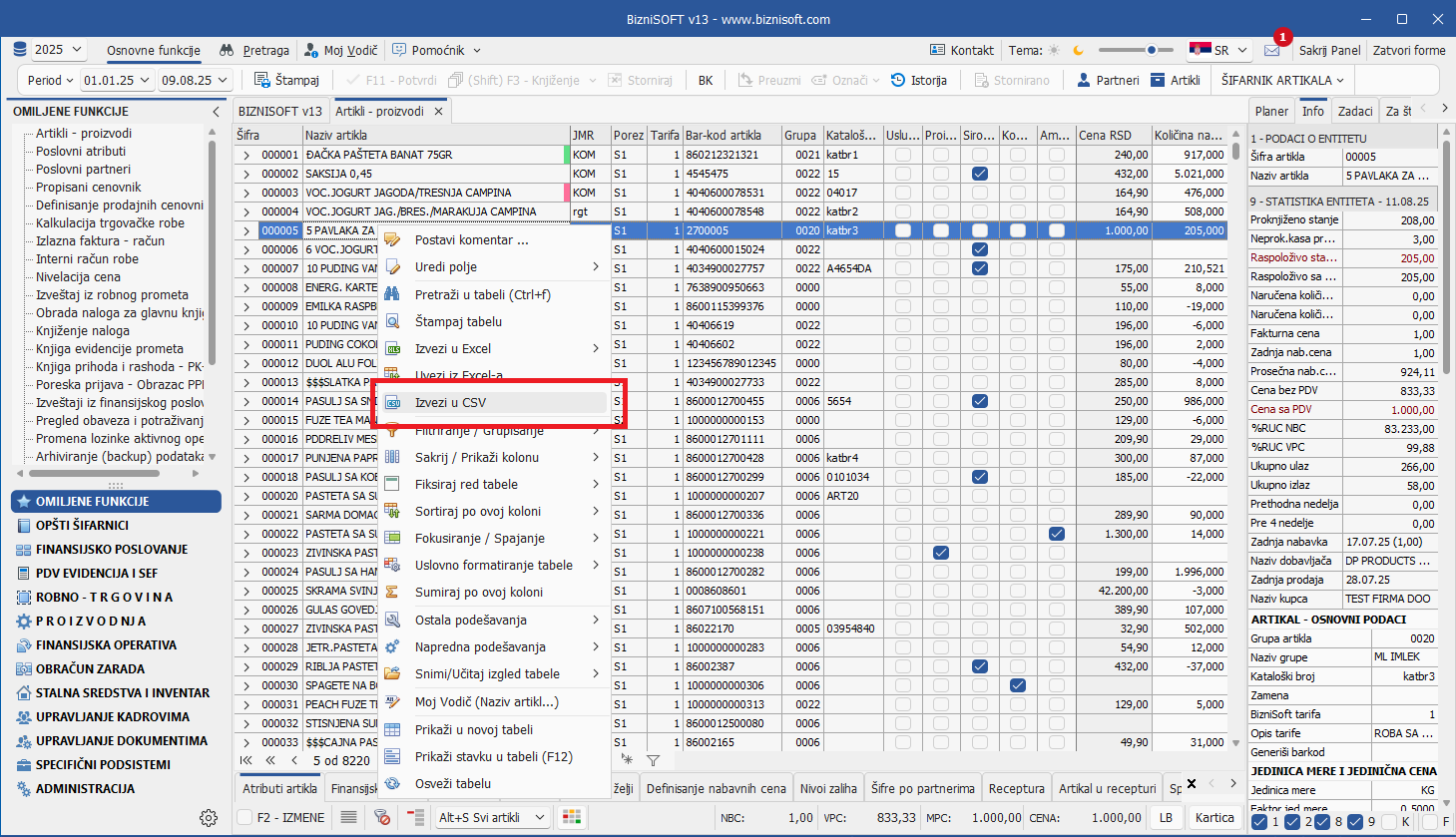 Omogućen je izvoz i čuvanje podataka u CSV formatu na nivou svih BizniSoft tabela izborom opcije Izvezi u CSV u standardnom meniju koji se poziva desnim klikom miša u bilo kojoj tabeli:
