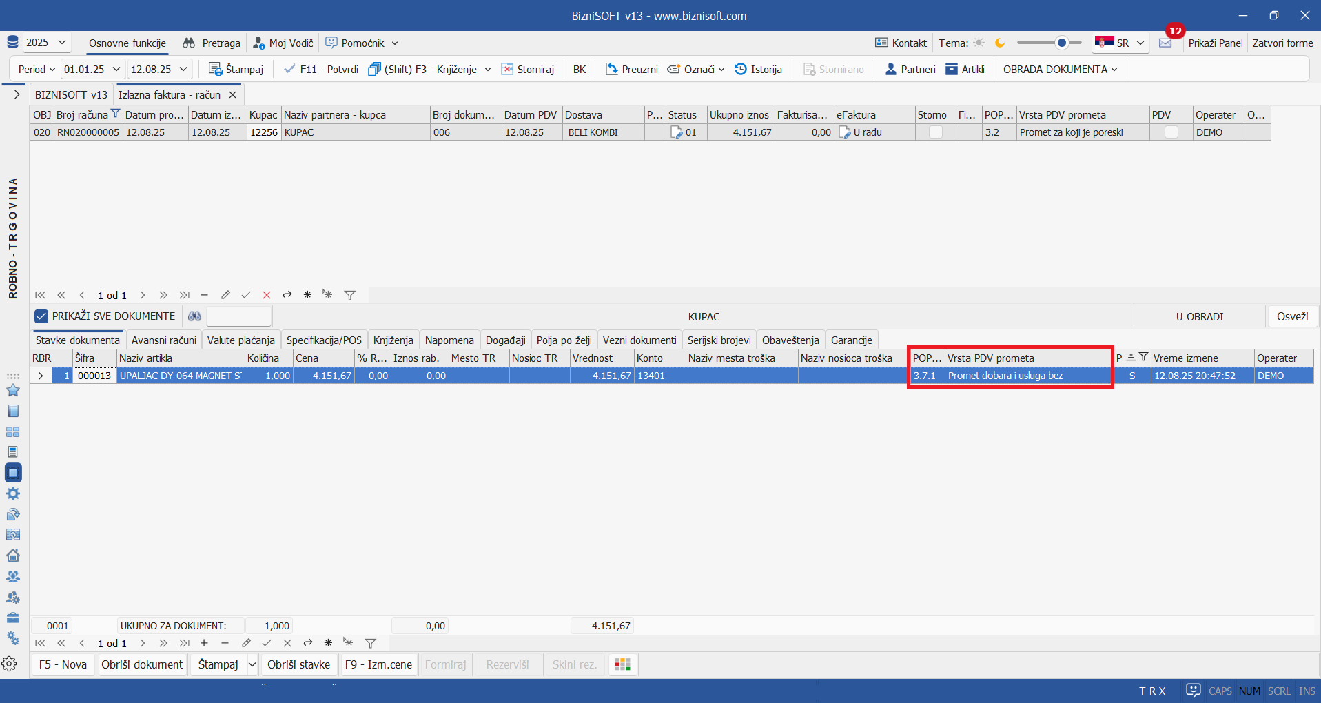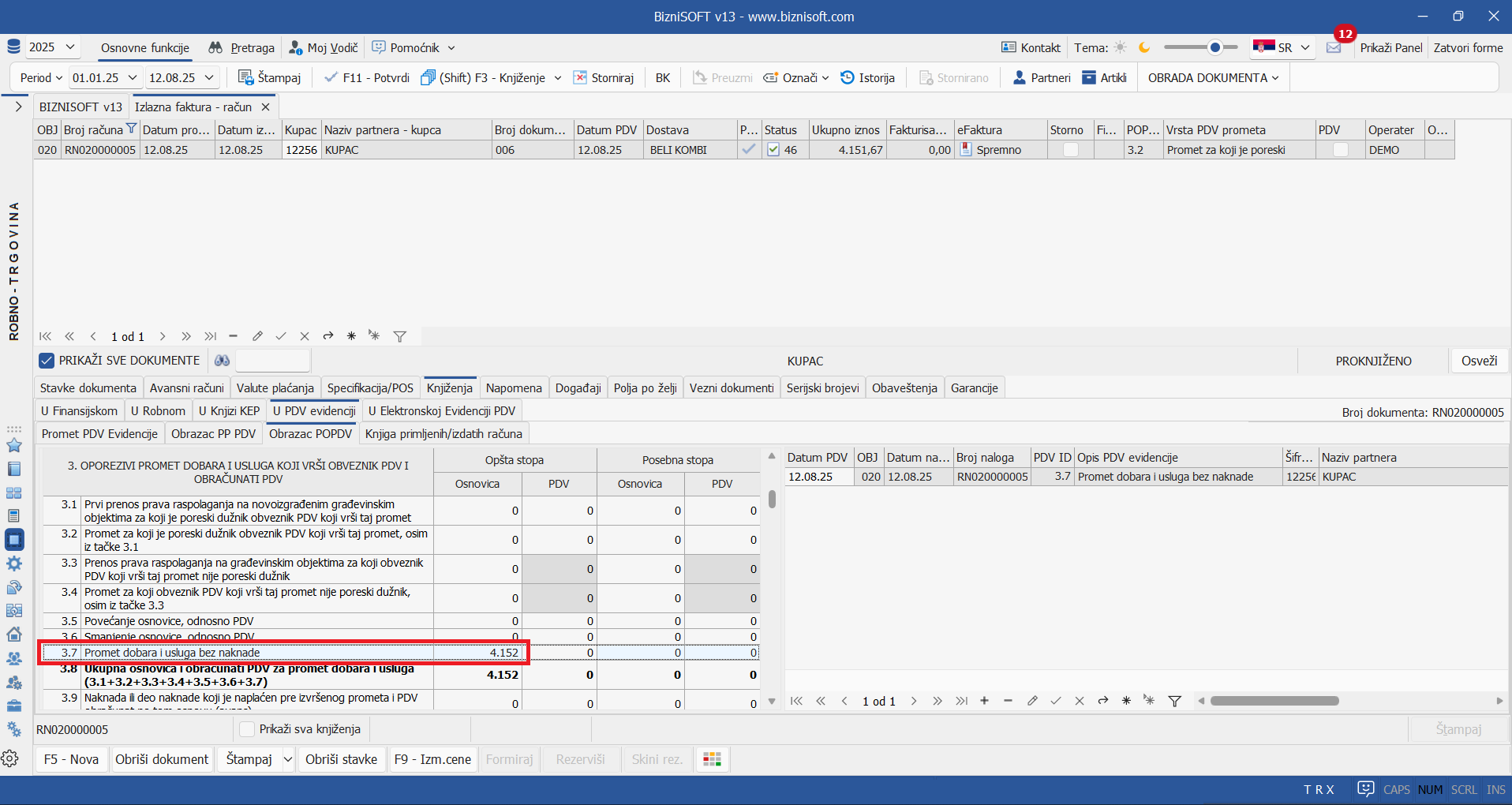 Implementirana je nova vrsta PDV prometa u izlaznim fakturama 3.7.x Promet dobara i usluga bez naknade, bez obaveze obračunavanja PDV. Program će u tom slučaju knjižiti samo osnovicu na poziciji 3.7 u Obrascu POPDV ukoliko obveznik PDV, u ovom slučaju isporučilac dobara odnosno pružalac usluga, nije poreski dužnik za taj promet: