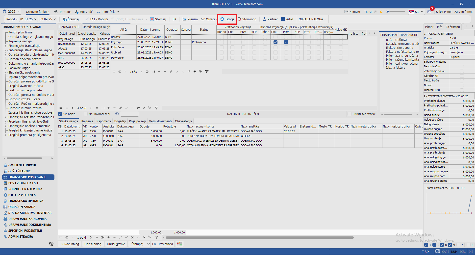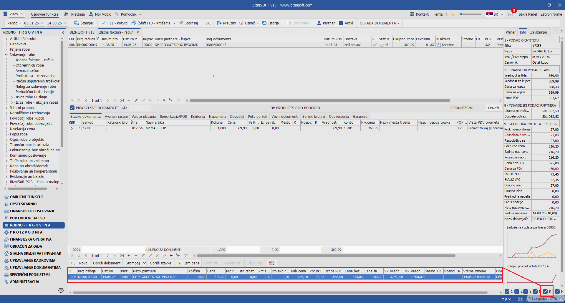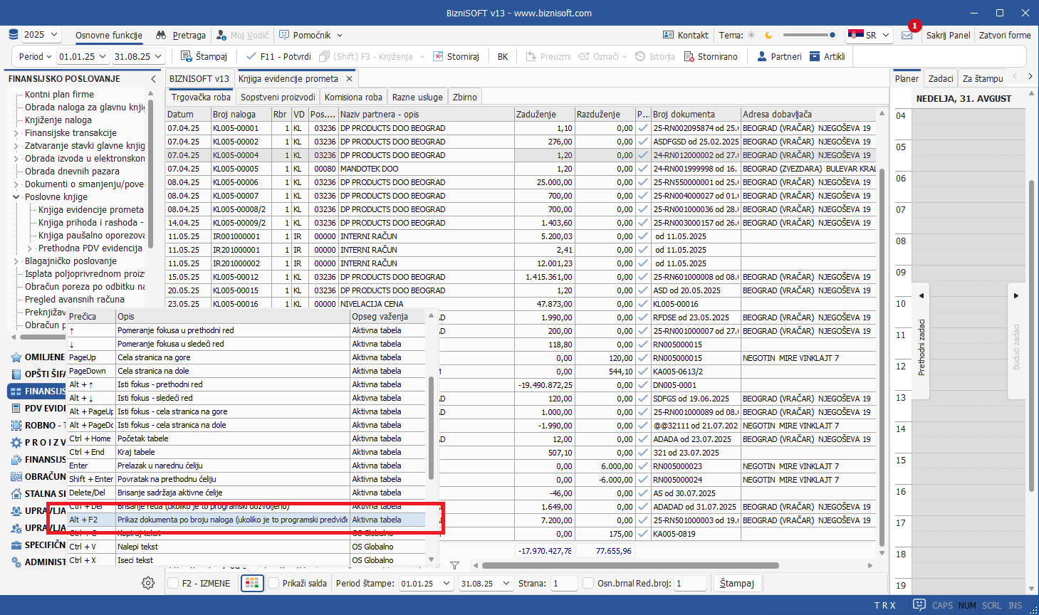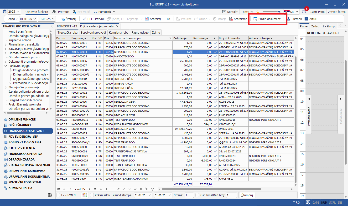 VAŽNO: Funkcionalnost prikaza dokumenata je u prethodnim verzijama programa bila omogućena u većini BizniSoft tabela na dva načina – duplim klikom i/ili posebnim dugmetom u samoj formi. U novoj verziji, ova funkcionalnost je redizajnirana: pokretanje pregleda pomoću duplog klika je izbačeno iz svih formi, a umesto toga (pod uslovom da je kursor fokusiran u tabeli), u zaglavlju će se pojaviti novo dugme Prikaži dokument. Prikaz dokumenta po broju naloga omogućen je pomoću nove prečice Alt+F2 koja je standardno dostupna i u formi prikaza BizniSoft tasterskih prečica: