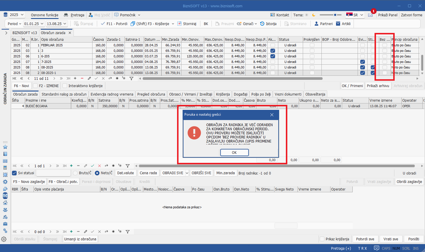 Implementirana je nova opcija u zaglavlju forme Obračun zarada pod nazivom Bez provere radnika. Ukoliko ova opcija nije štiklirana – a standardno nije, program će izvršiti proveru da li za konkretnog radnika postoji obračun (a taj obračun nije akontacija) za isti obračunski period i ukoliko je obračun već izvršen, prikazaće se sistemsko obaveštenje o grešci: Obračun za radnika je već odrađen za konkretan obračunski period. Ovu proveru operater može isključiti čekiranjem opcije Bez provere radnika u zaglavlju obračuna i potvrditi upis promene klikom na polje OK/Primeni: