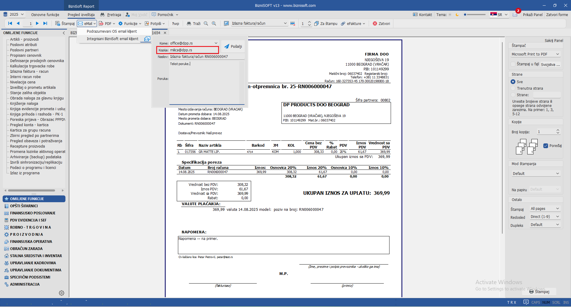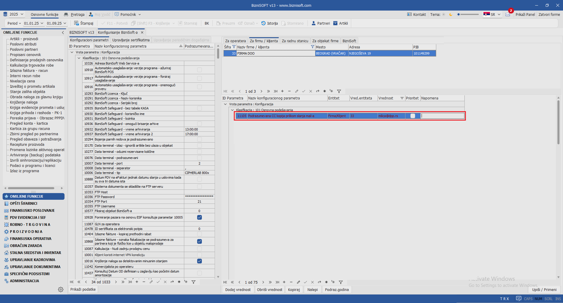 Implementiran je nov konfiguracioni parametar 11105 – Podrazumevana CC kopija prilikom slanja mail-a. Ukoliko je izvršena aktivacija novog parametra i uneta mejl adresa u polju Vrednost, omogućeno je automatsko popunjavanje CC polja (kopija) prilikom slanja e-mail poruka direktno iz programa kako pomoću integrisanog e-mail klijenta tako i za podrazumevani OS e-mail klijent: