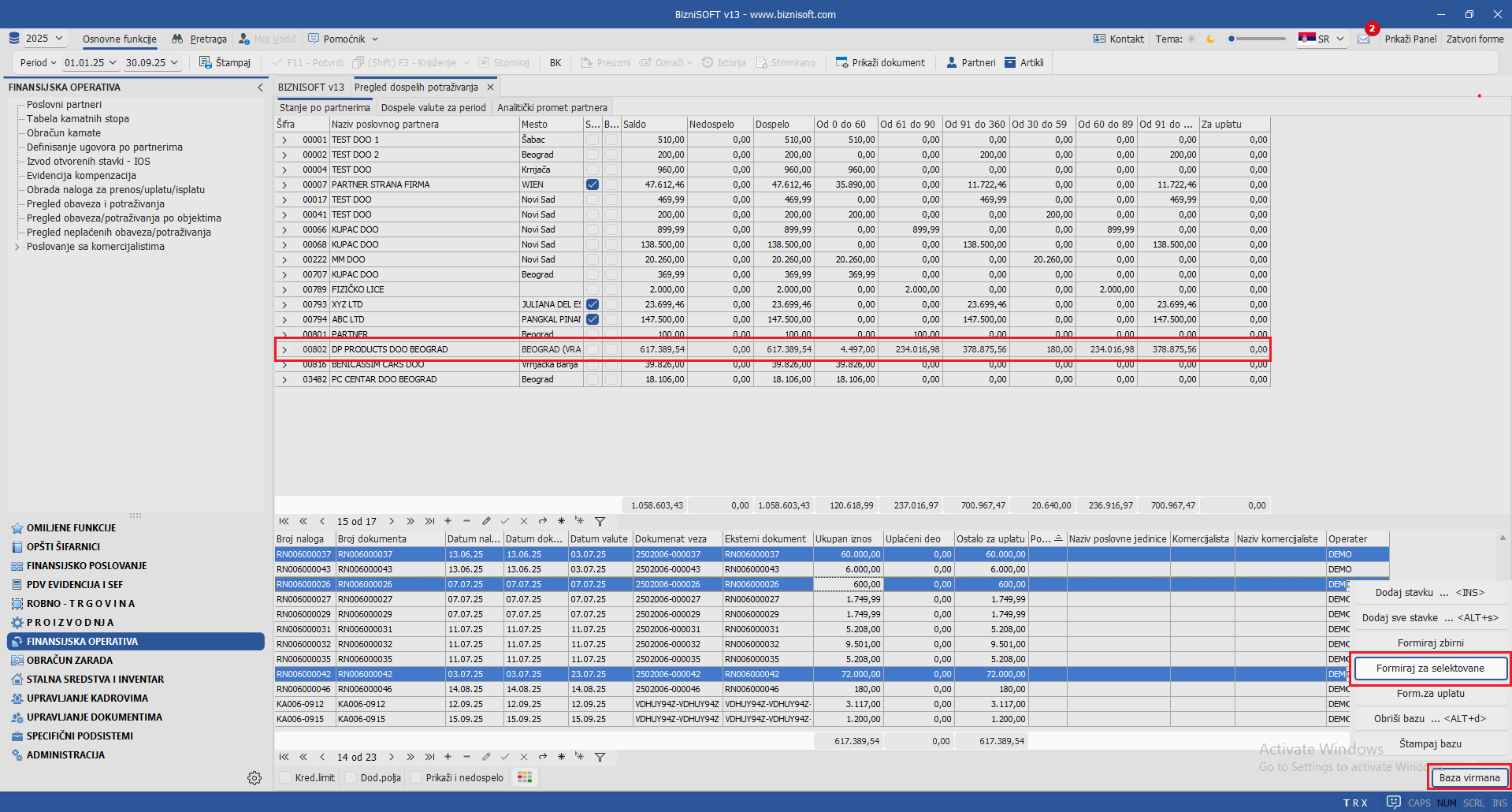 U meniju Baza virmana uvedena je nova opcija Formiraj za selektovne. Pokretanjem ove opcije omogućeno je formiranje i štampa grupnog virmana na osnovu više selektovanih računa pomoću standardne kombinacije tastera Shift+levi klik, odnosno CTRL+levi klik: