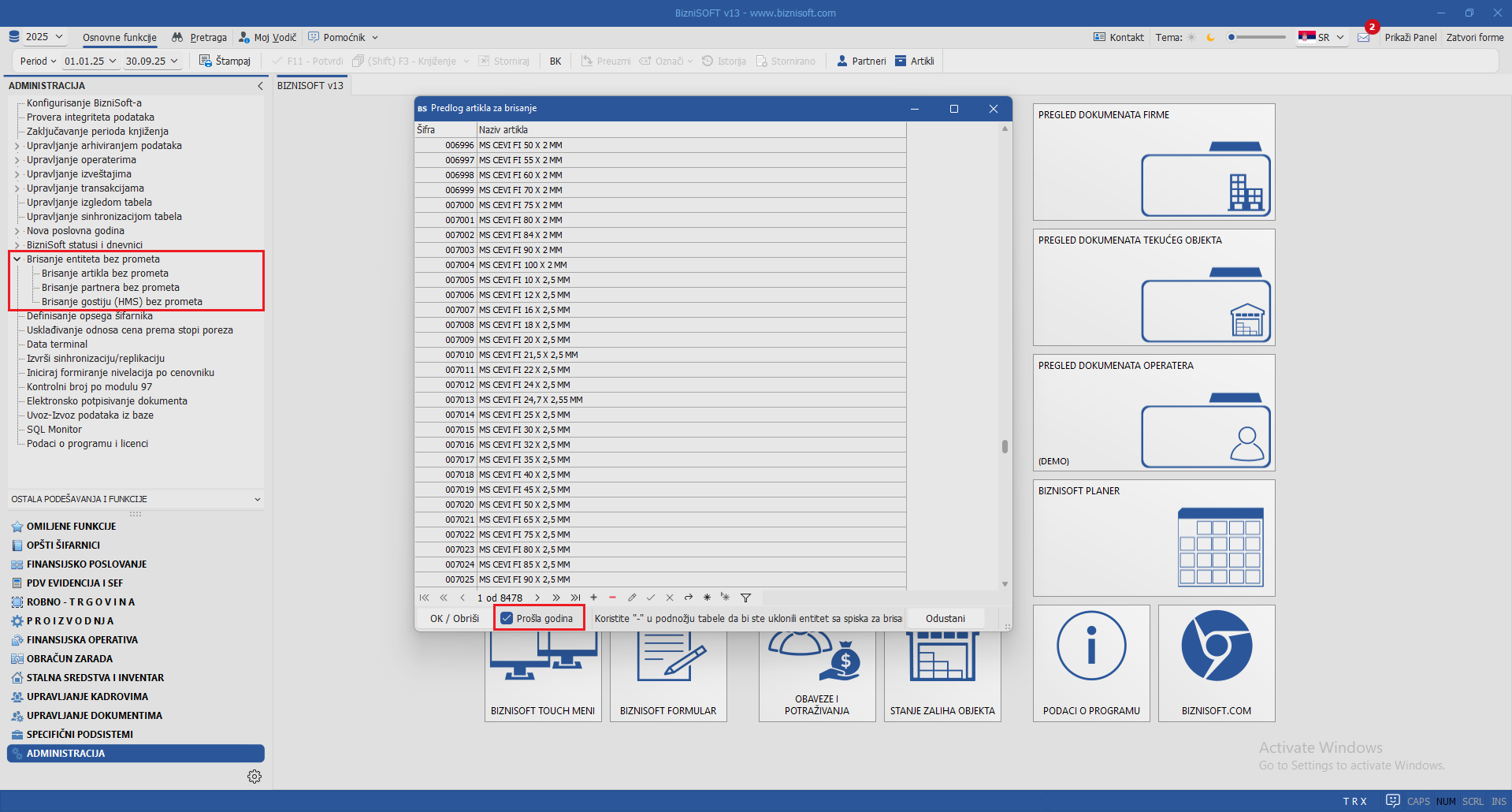 Implementirano je novo checkbox polje Prethodna godina u formi Brisanje entiteta bez prometa za sve vrste entiteta. Ukoliko je ovo polje čekirano, program će automatski izvršiti brisanje podataka i u prethodnoj godini ako postoje:
