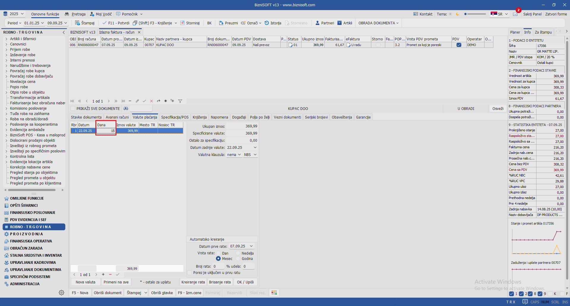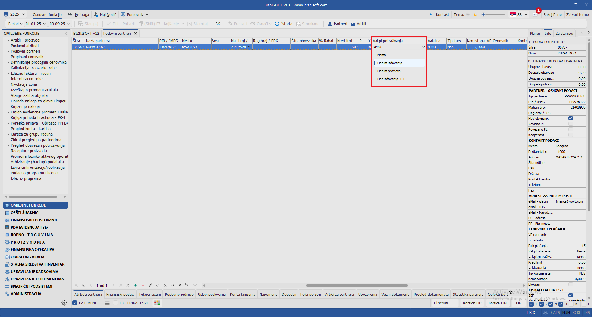 U Šifarniku poslovnih partnera dodata je nova kolona Valuta plaćanja – potraživanja koja može imati sledeća obeležja: Nema, Datum izdavanja, Datum prometa i Datum izdavanja + 1: