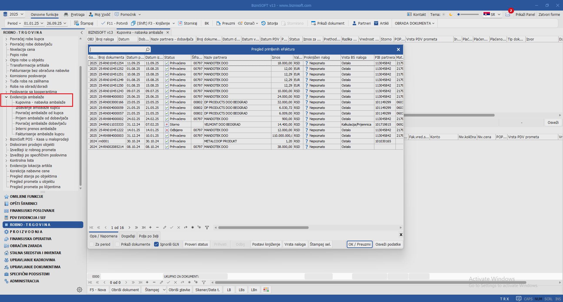 Analogno ostalim ulaznim dokumentima, u delu Kupovina – nabavka ambalaže omogućeno je preuzimanje eFakture sa SEF-a pomoću standardne prečice ALT+F: