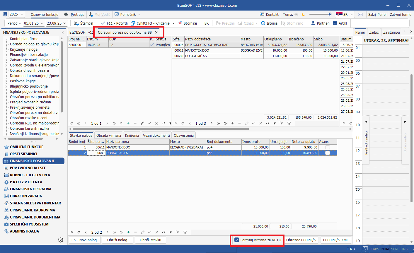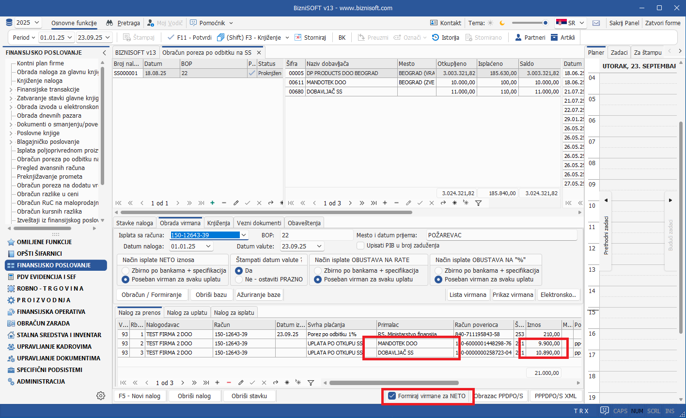 U formi Obračun poreza po odbitku na SS, implementiran je nov checkbox Formiraj virmane za NETO. Ukoliko je ova opcija štiklirana, program će standardno kroz tab Obrada virmana omogućiti formiranje virmana za neto isplate prema dobavljačima sekundarnih sirovina: