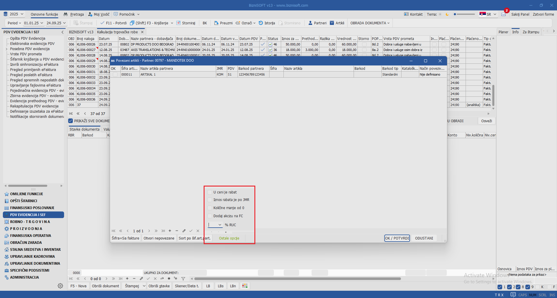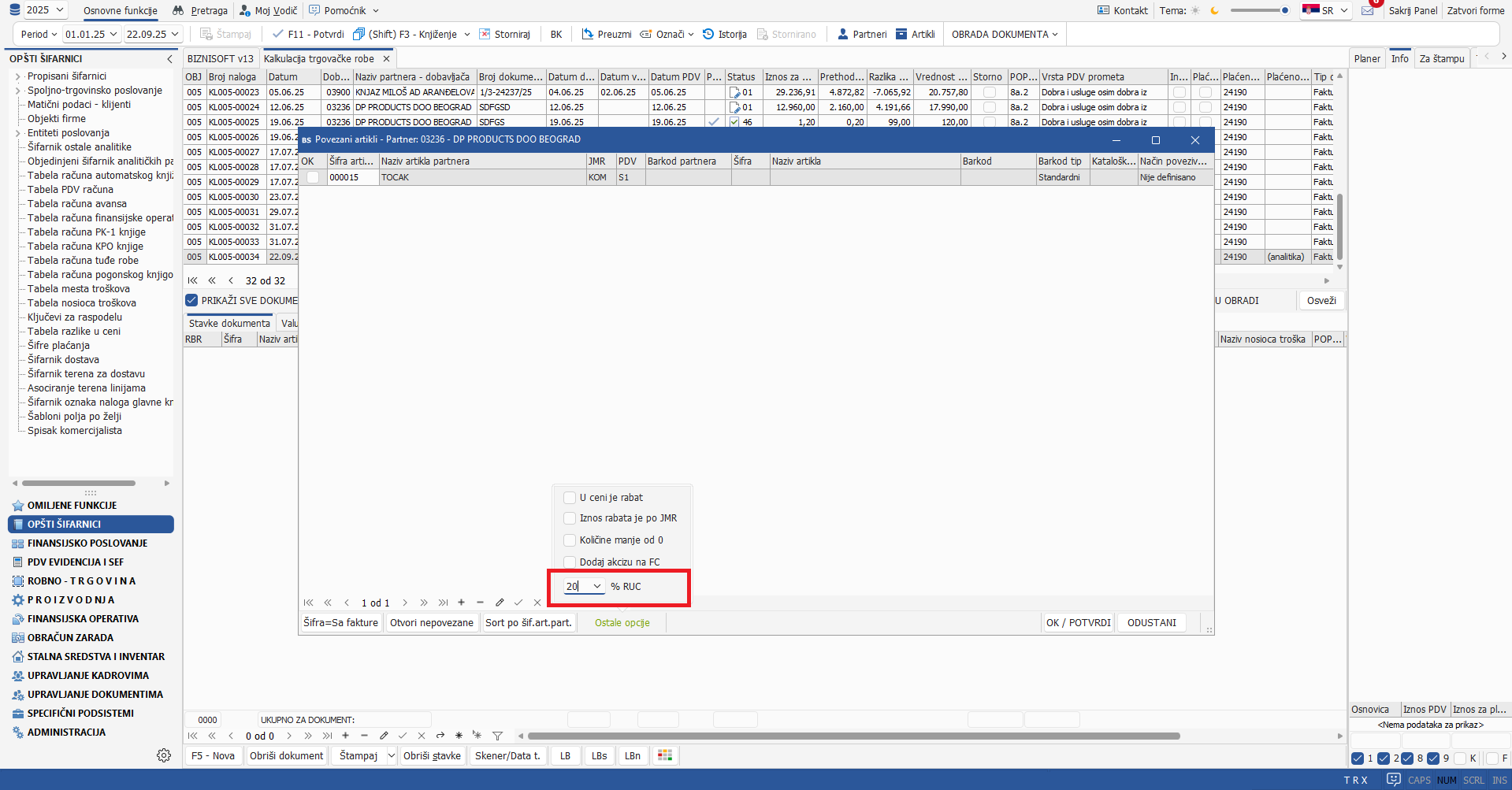 Izvršen je redizajn forme Povezani artikli uvođenjem posebnog menija Ostale funkcije radi bolje preglednosti dodatnih opcija – U ceni je rabat, Iznos rabata je po JMR, Količina je manja od 0, Dodaj akcizu na FC, %RUC: