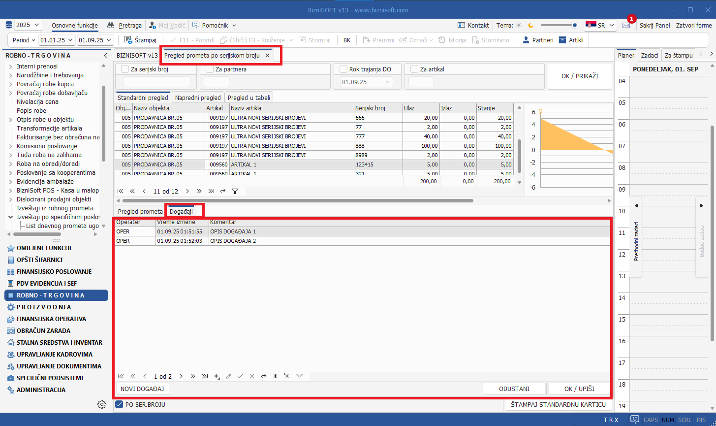 Proširena je forma Pregled prometa po serijskom broju uvođenjem standardne funkcije Događaji koja se može iskoristiti za hronološko vođenje detaljne evidencije o konkretnom serijskom broju: