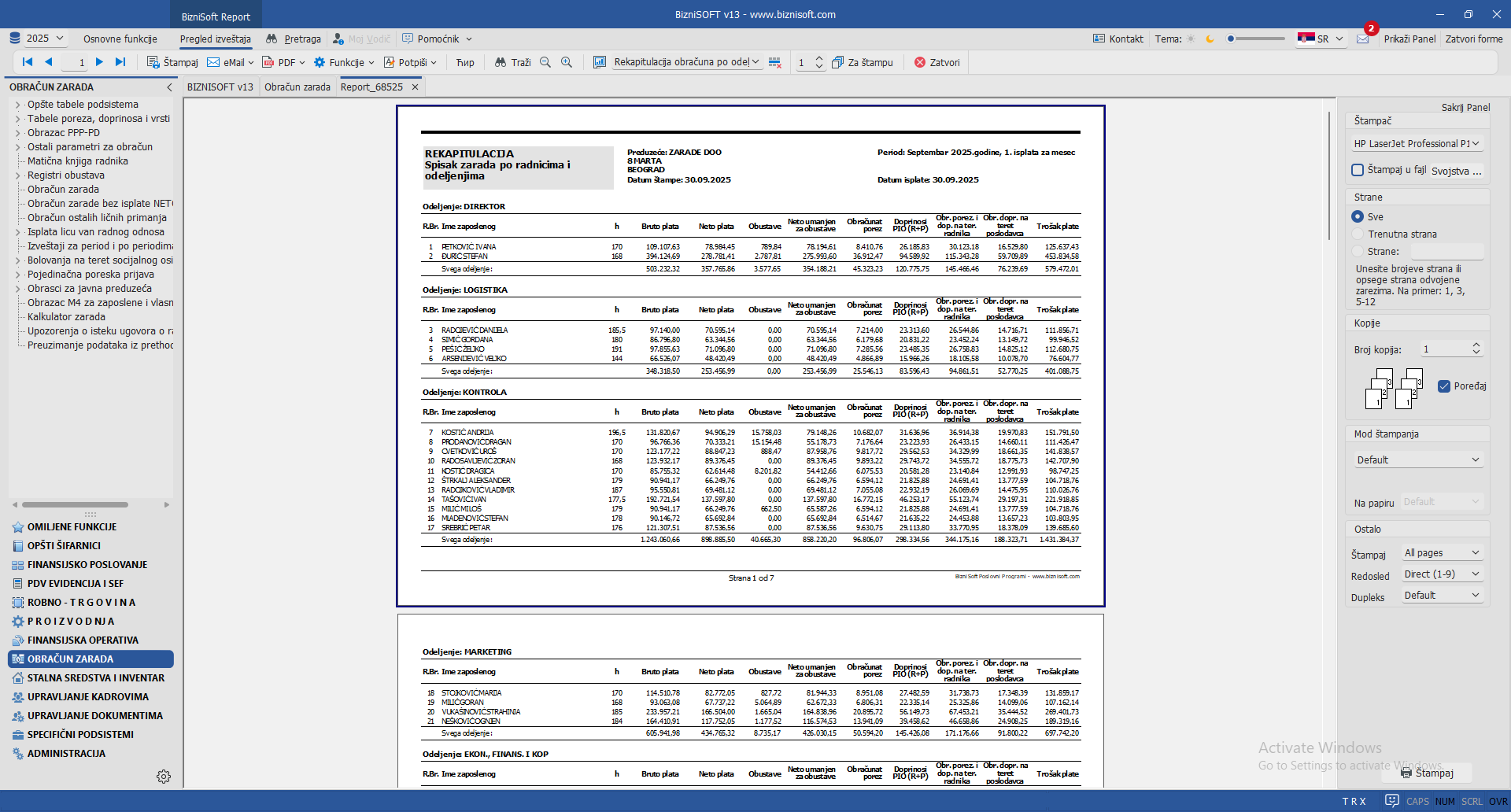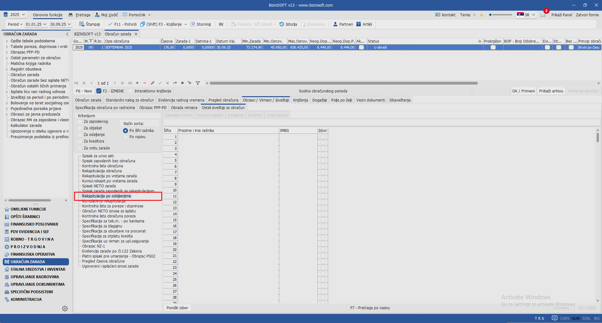 Pokretanjem nove opcije Rekapitulacija po odeljenjima u delu Ostali izveštaji za obračun, omogućeno je generisanje izveštaja za sve radnike, a koji će biti grupisan po odeljenjima: