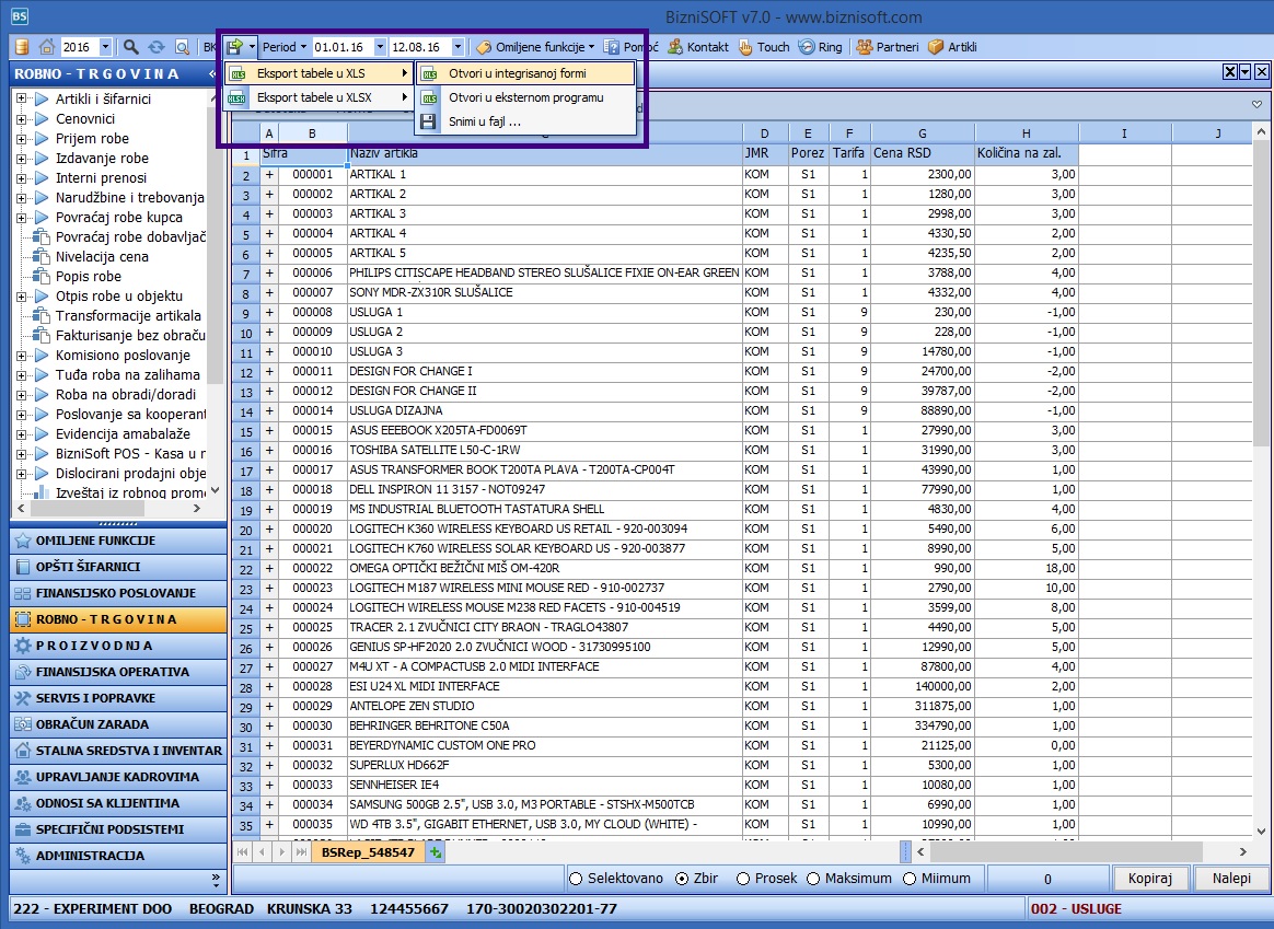 Implementiran je tzv. “Integrisani Excel”. Ovo praktično znači da klijent ne mora da ima instaliran ni Excel niti OpenOffice na svom računaru da bi koristio funkcije Excel-a, već je sada to integrisano u BizniSoft-u. Klijent može da bira da li želi da se tabela otvori u integrisanoj formi ili u eksternoj aplikaciji – dodata mogućnost i da se odmah snimi u XLS/XLSX fajl. Sada je klijentu potreban samo Windows i BizniSoft i time će zadovoljiti sve svoje poslovne potrebe. Veliku korist od ove funkcije će imati i BSLIVE klijenti, obzirom da se LibreOffice koji je bio instaliran na BSLIVE-u nije baš najbolje pokazao u uslovima kada na istom serveru rade više osoba, te je u tom smislu otvaranje XLS/XLSX fajla u eksternom programu na BSLIVE-u sada onemogućeno. Imeplementirana funkcija automatskog sabiranja selektovanih ćelija (u donjem desnom uglu) a to je najčešća potreba zbog koje se neka BizniSoft tabela eksportovala u Excel. Takođe, omogućeno je da se ova vrednost (zbir selektovanih tabela) jednim klikom kopira i nalepi u bilo koju ćeliju. Naravno, omogućen je i rad sa svim osnovnim i naprednim Excel funkcijama i sve je to demonstrirano na ekranskim primerima u nastavku.