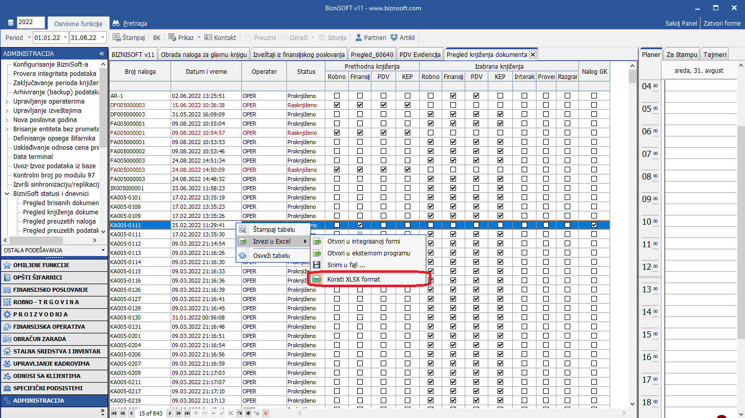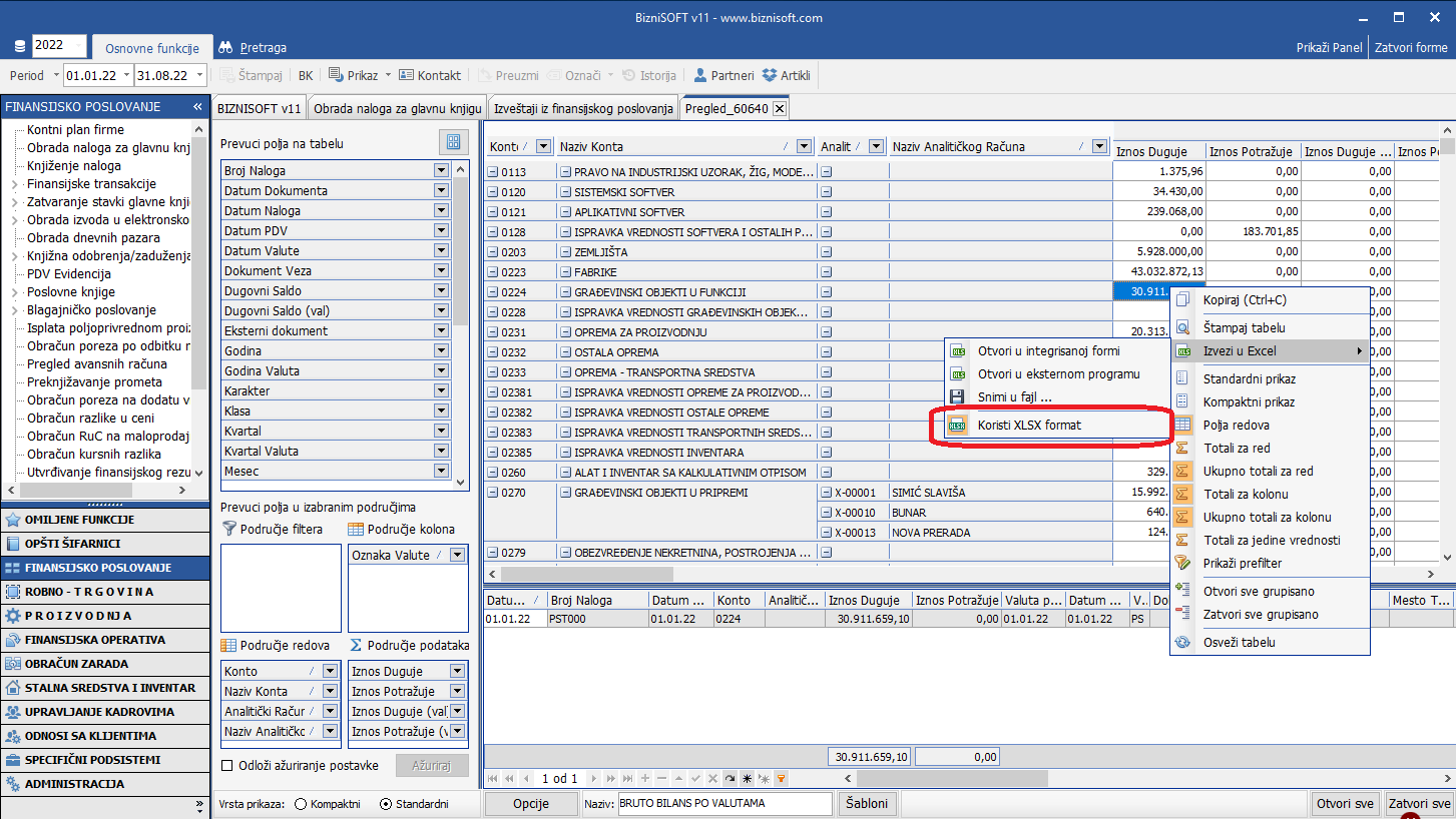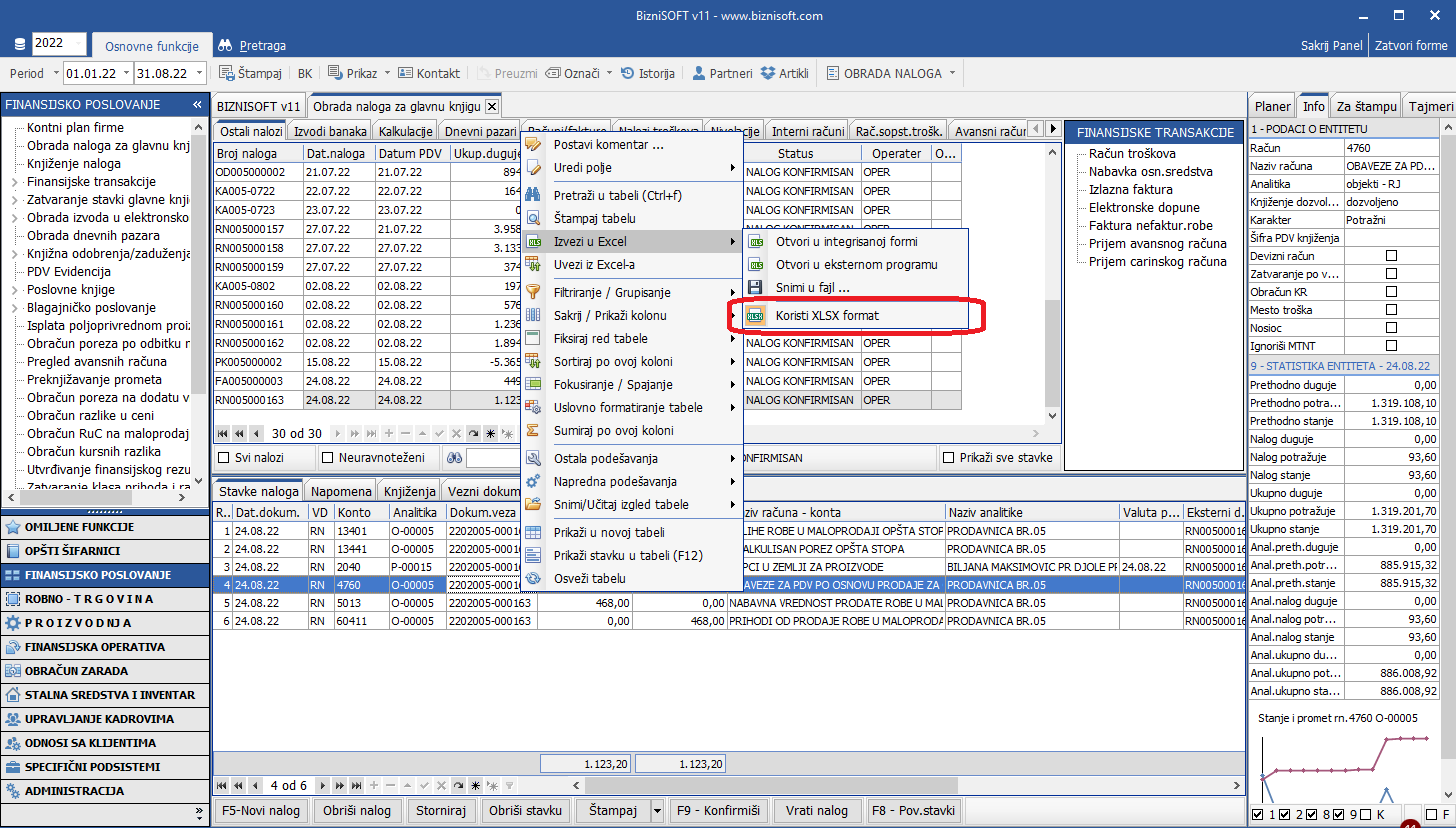 U verziji Build: bsv110-21897 Relase date: 31.08.2022. [bluetext]Koristi XLSX format[/bluetext] postavljen je kao podrazumevani format za izvoz u Excel u svim BizniSoft tabelama: