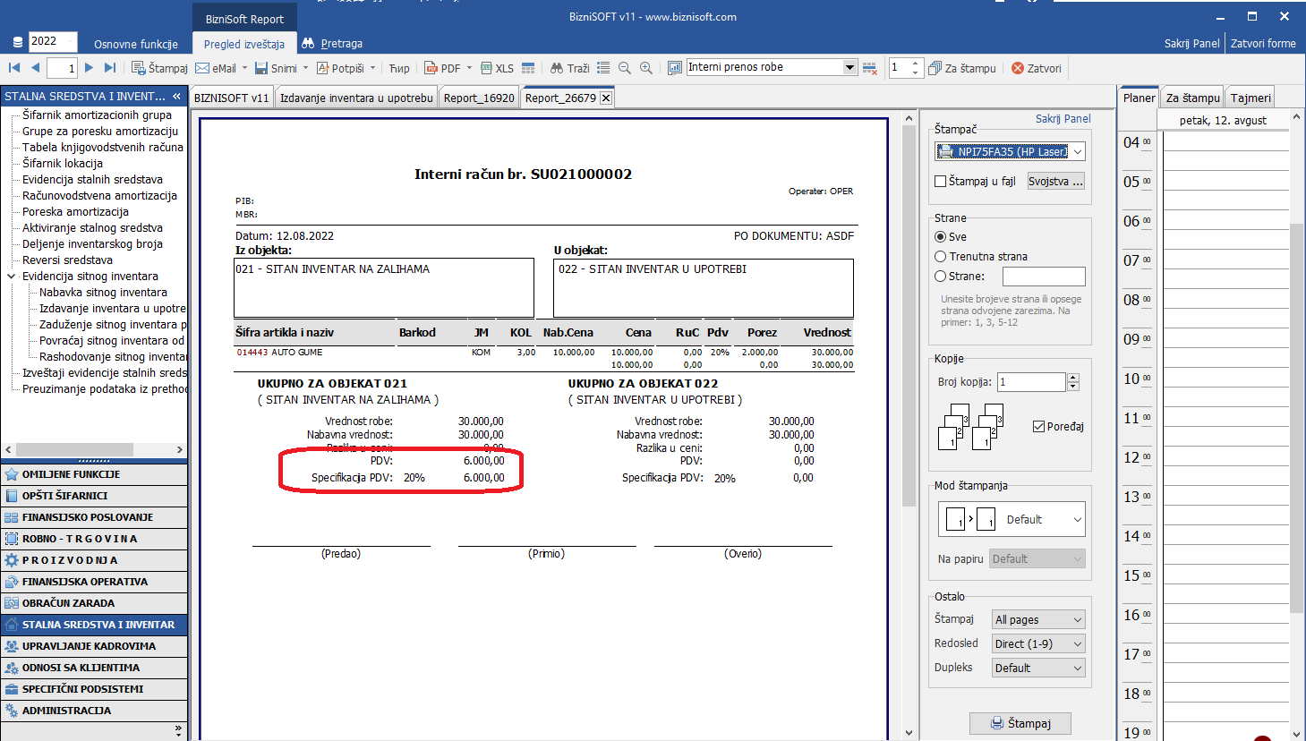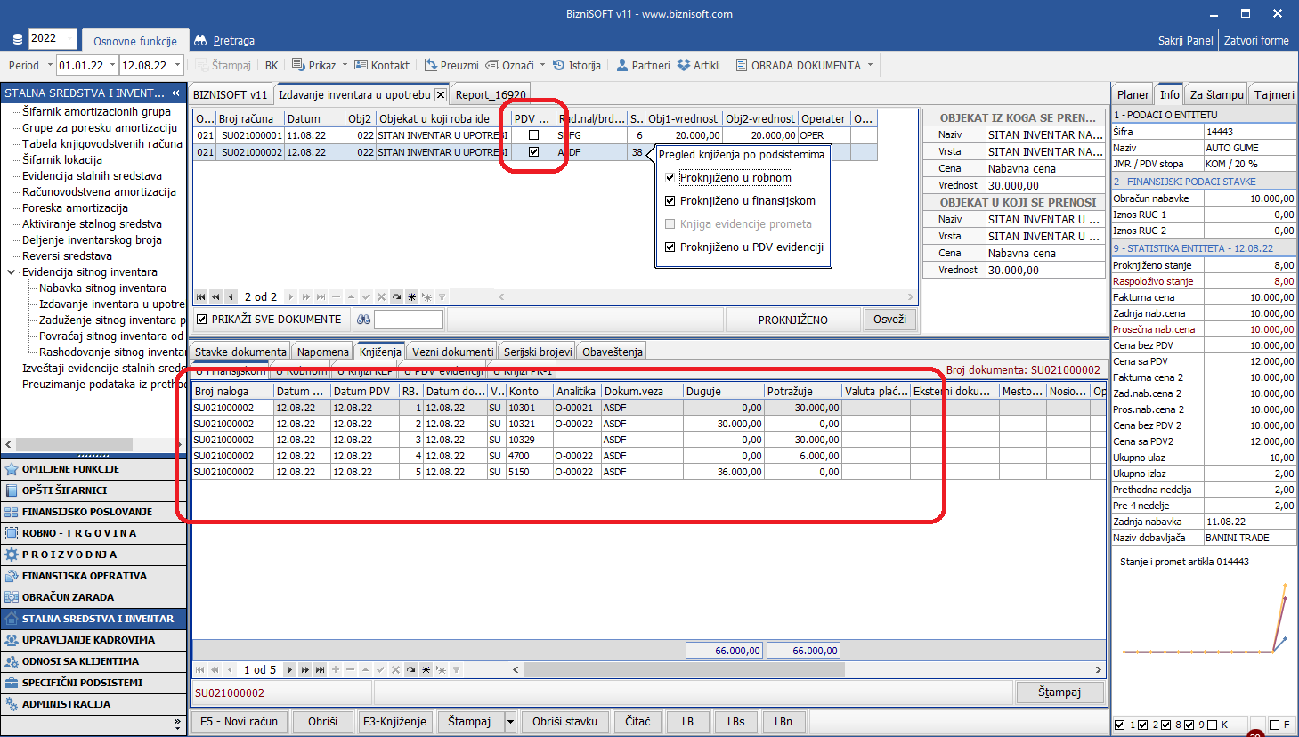 Ukoliko se štiklira PDV obračun u transakciji izdavanja sitnog inventara u upotrebu, biće proknjižen obračun PDV uz adekvatan prikaz u formi izveštaja: