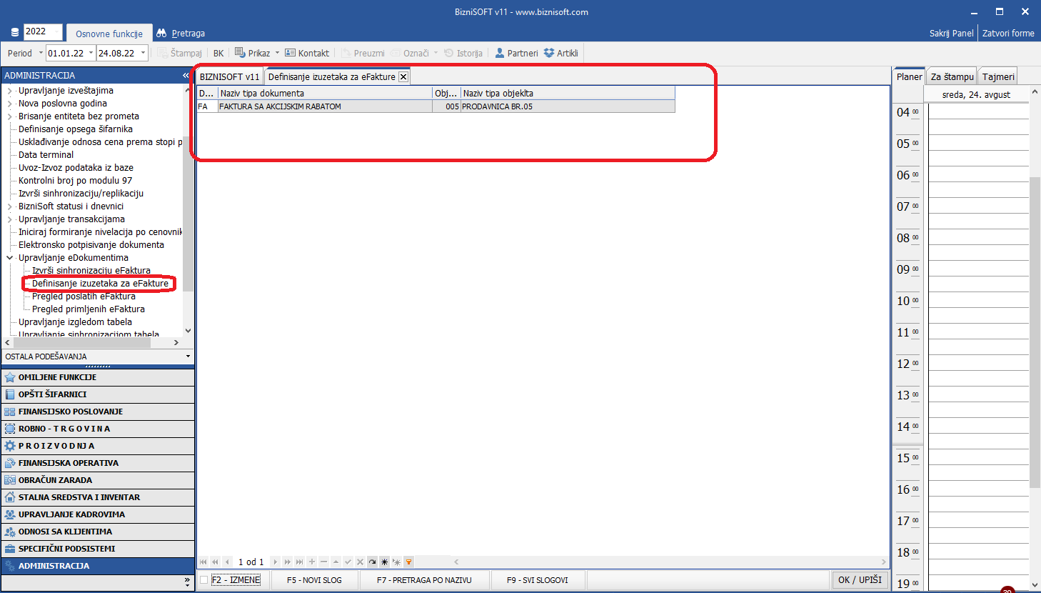U verziji Build: bsv110-21886 Relase date: 15.08.2022. unapređena je forma primljenih e-Faktura. Sve nove funkcionalnosti u ovom kontekstu, predstavljene su u našem uputstvu Elektronska razmena faktura. U poslednjim ažuriranjima verzije, implementirana je nova funkcija [bluetext]Definisanje izuzetaka za eFakture[/bluetext] koja omogućuje korisniku da za pojedine vrste dokumenata u pojedinim objektima definiše da se eFakture ne registruju, što može biti zgodno u nekim situacijama (naplata komunalnih i ostalih usluga, fakture za fizička lica i slično):