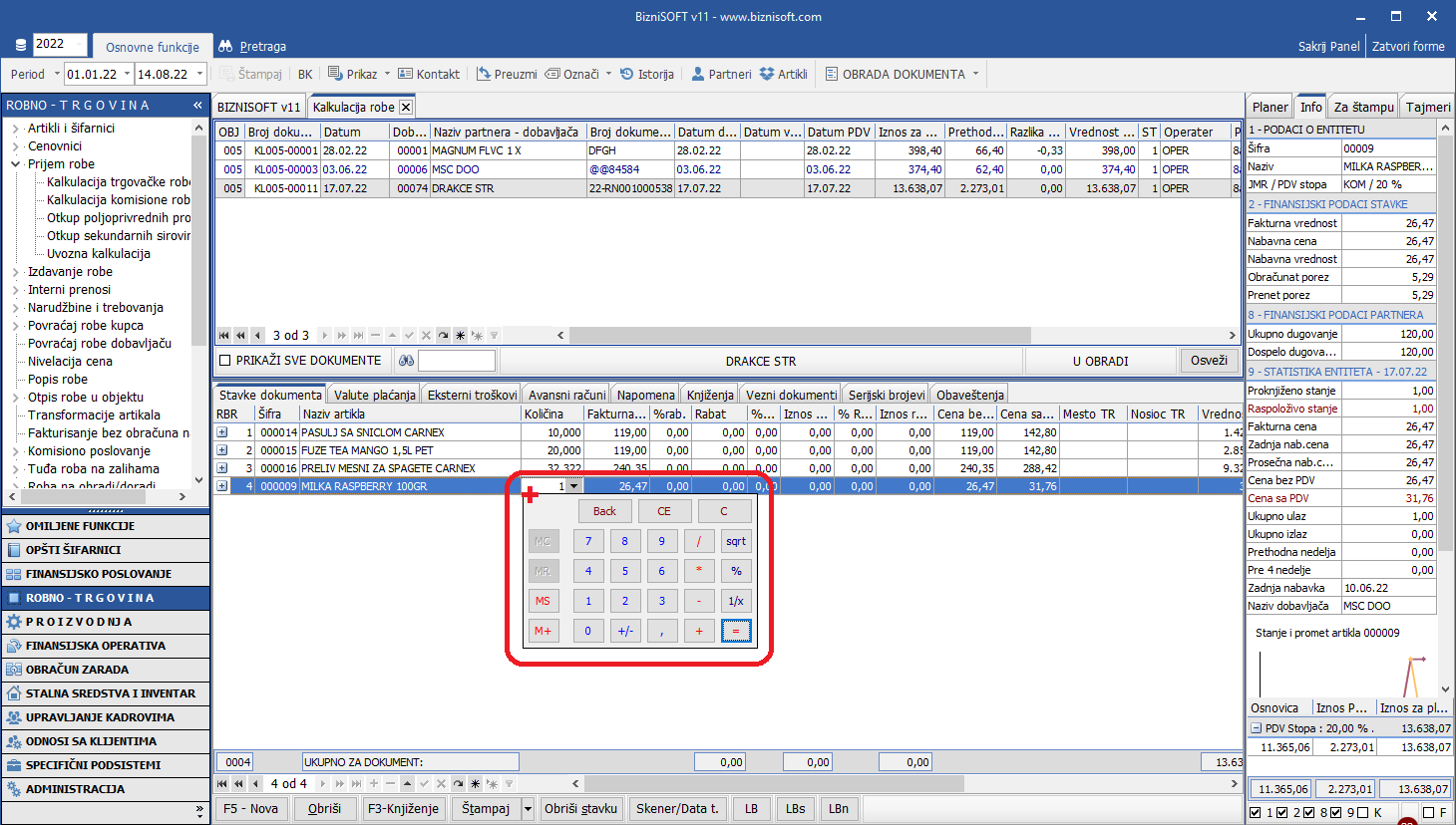 U verziji Build: bsv110-21886 Relase date: 14.08.2022. omogućen je prikaz kalkulatora pritiskom na taster + na tastaturi, u polju [bluetext]Količina[/bluetext] u kalkulacijama (i nasleđenim tabelama), što može biti praktično u specifičnim uslovima kada na fakturi postoji više stavki sa istom šifrom artikla: