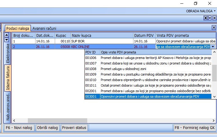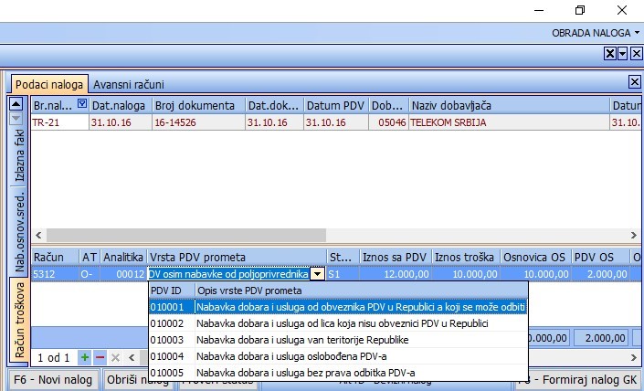 U Računu troškova – Podaci naloga i ostalim funkcijama u Formiranju naloga, ubačeno je novo polje Vrsta PDV prometa i sada se ovim poljem definiše upis u pdv evidenciju. U polju stopa bira se jedna od tri ponuđenih – S1, S2 i S0 (20%, 10% i bez pdv-a).