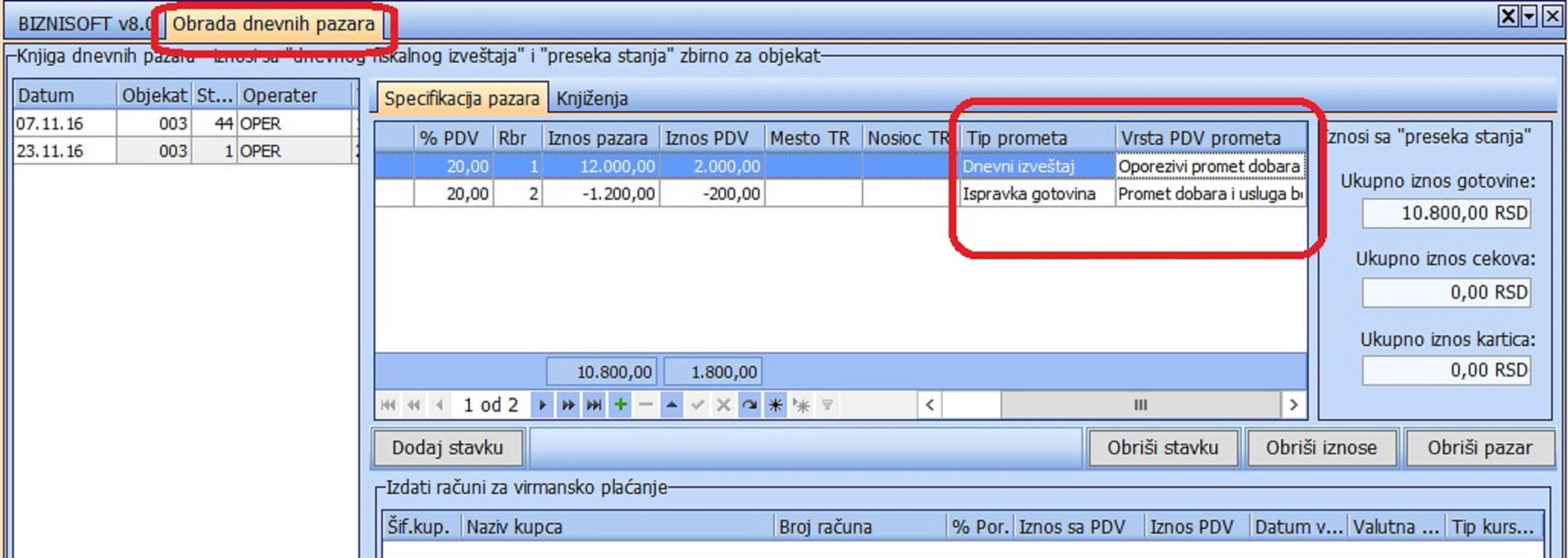 U funkciji obrade dnevnih pazara, ubačene su nove kolone u skladu sa novom PDV evidencijom kao i novo obeležje tipa prometa kojim je moguće jasno definisati ispravku po izdatom Nalogu za ispravku a radi ispravnog knjiženja u KEP knjizi.