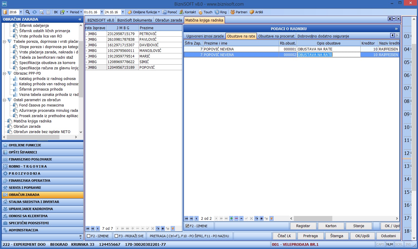Obustave na procenat, obustave na rate i dodatno osiguranje su ubačeni kao šifarnici u Matičnoj knjizi radnika – za selektovanog radnika. Ove forme su izbačene iz glavnog menija