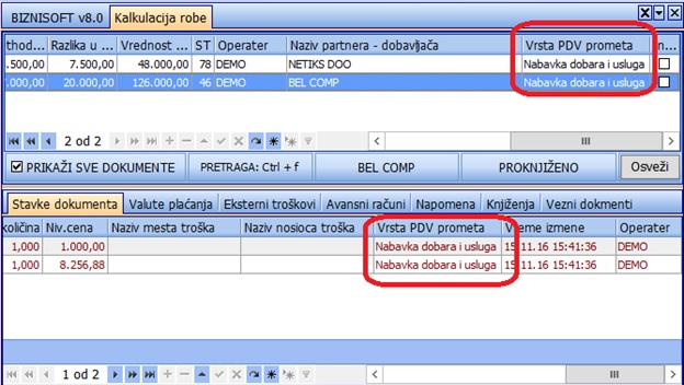 U svim transakcijama je uvedeno novo polje Vrsta PDV prometa na osnovu koga se kasnije vrši knjiženje u PDV evidenciji. Vrednost polja Vrsta PDV prometa BizniSoft određuje automatski ali operater može da promeni po potrebi. U transakcijama ulaza i izlaza i nasleđenim formama (kalkulacije, fakture i slično), Vrsta PDV prometa koja je definisana u zaglavlju dokumenta predstavlja vrednost koja se nudi u stavkama dokumenta ali se ova vrednost može promeniti čak i za konkretnu stavku (primer – konkretne stavke u kalkulacijama za koje ne postoji pravo odbitka PDV).