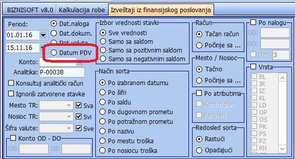 Dodato je novo polje u svim BizniSoft transakcijama pod nazivom Datum PDV. PP PDV obrazac se sada formira isključivo po ovom datumu. Datum PDV se nudi automatski ali ga operater može promeniti. Ovo polje je dodato i u finansijskom prometu kao i u okviru Izveštaja iz finansijskog radi efikasnije kontrole PDV evidencije. Vrednost ovog polja se uzima u obzir i prilikom provere integriteta podataka, tj. kontrole slaganja finansijskog prometa sa PDV Evidencijom Administracija – Provera integriteta podataka i ova provera je modifikovana u skladu sa novom strukturom. Datum PDV kao ni polje „Vrsta PDV prometa“ se ne pojavljuju u formama klijenta koji nije u sistemu PDV-a!