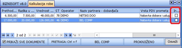 U formama prijema (kalkulacije) implementiran je novi checkbox Interni obračun PDV. Dosadašnja funkcionalnost definisanja artikla kao artikal po kome se vrši obrnuto oporezivanje je ostala nepromenjena ali smatramo da je mnogo bolje ovu funkcionalnost definisati na nivou konkretnog dokumenta od varijante u kome se ovo definiše po artiklu: