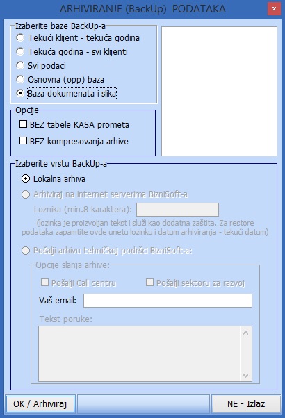 Budući da su u novijim verzijama tzv. „binarni“ podaci (slike, dokumenta) skladište u novoj bazi pod nazivom „biznisoftbinaries“, omogućeno i zasebno arhiviranje samo ove baze, izborom opcije Baza dokumenata i slika a standardno se arhivira prilikom izbora funkcije Svi podaci:
