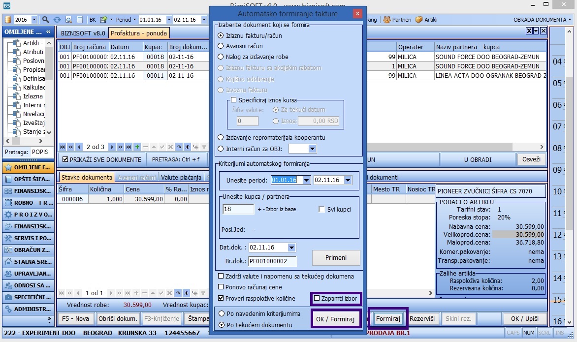 Implementirana je nova opcija – checkbox u formi formiranja dokumenta na osnovu profakture/otpremnice kojom je omogućeno da se zapamte prethodno izabrane opcije: