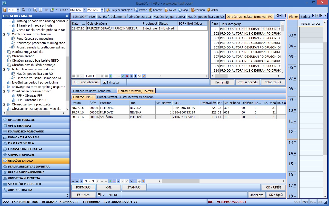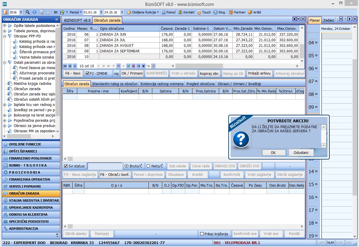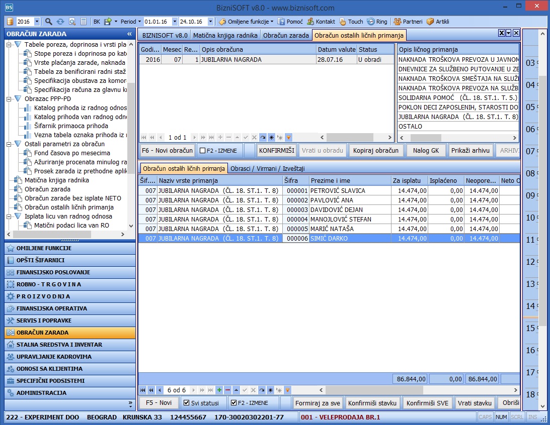 Integrisan je obračun zarada sa parametrima za obračun zarada. Sada je ova forma u “master-detail” formatu analogno ostalim formama u BizniSoft-u. Sa glavnog menija je izbačena funkcija parametra za obračun zarada