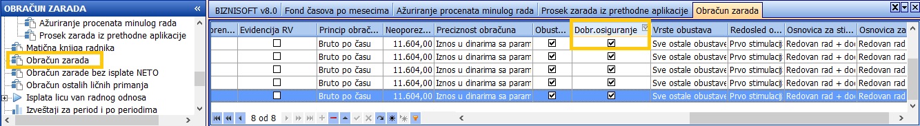Prilikom unosa zaglavlja u obračunu zarada, izbačena je dosadašnja forma Da li želite da se obračuna dodatno dobrovoljno osiguranje. Ukoliko za radnika postoji definisano dobrovoljno dodatno osiguranje kao obustava, ista će biti automatski obračunata ukoliko je u parametrima obračuna štiklirana opcija Dobrovoljno osiguranje. Obračun osiguranja sa “+” na poljima u zaglavlju obračuna je i dalje ostala kao opcija, ukoliko je korisniku potrebno ili ukoliko se javi greška prilikom obračuna ove obustave.